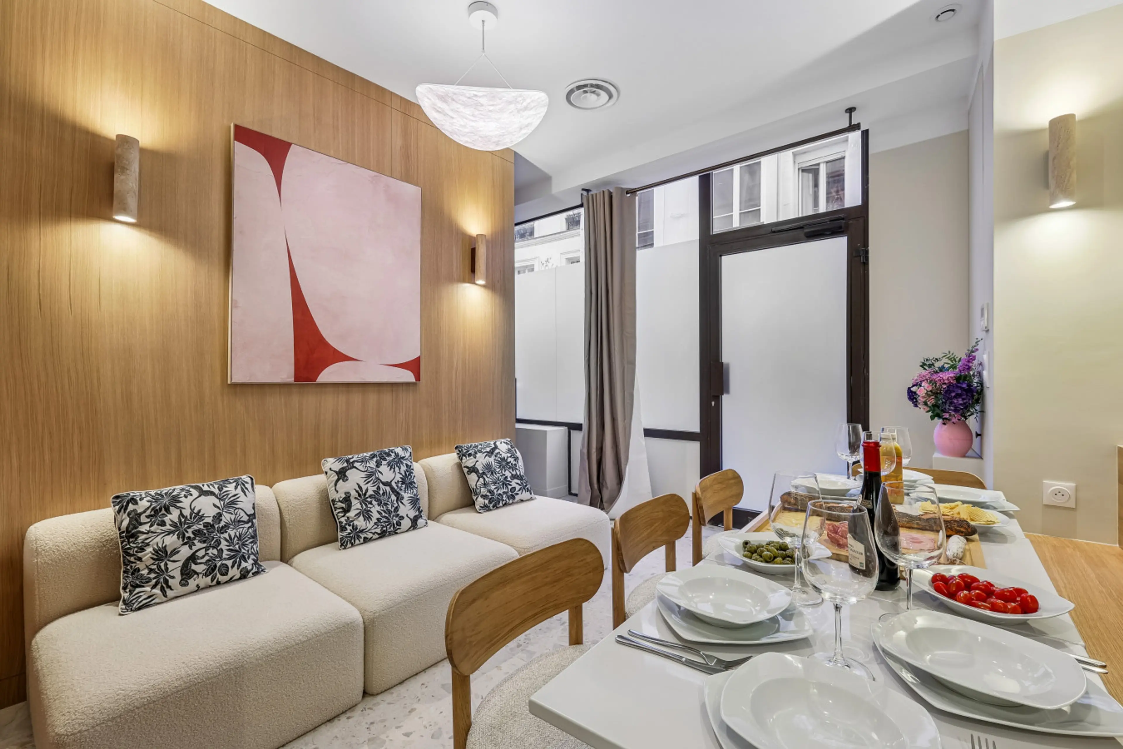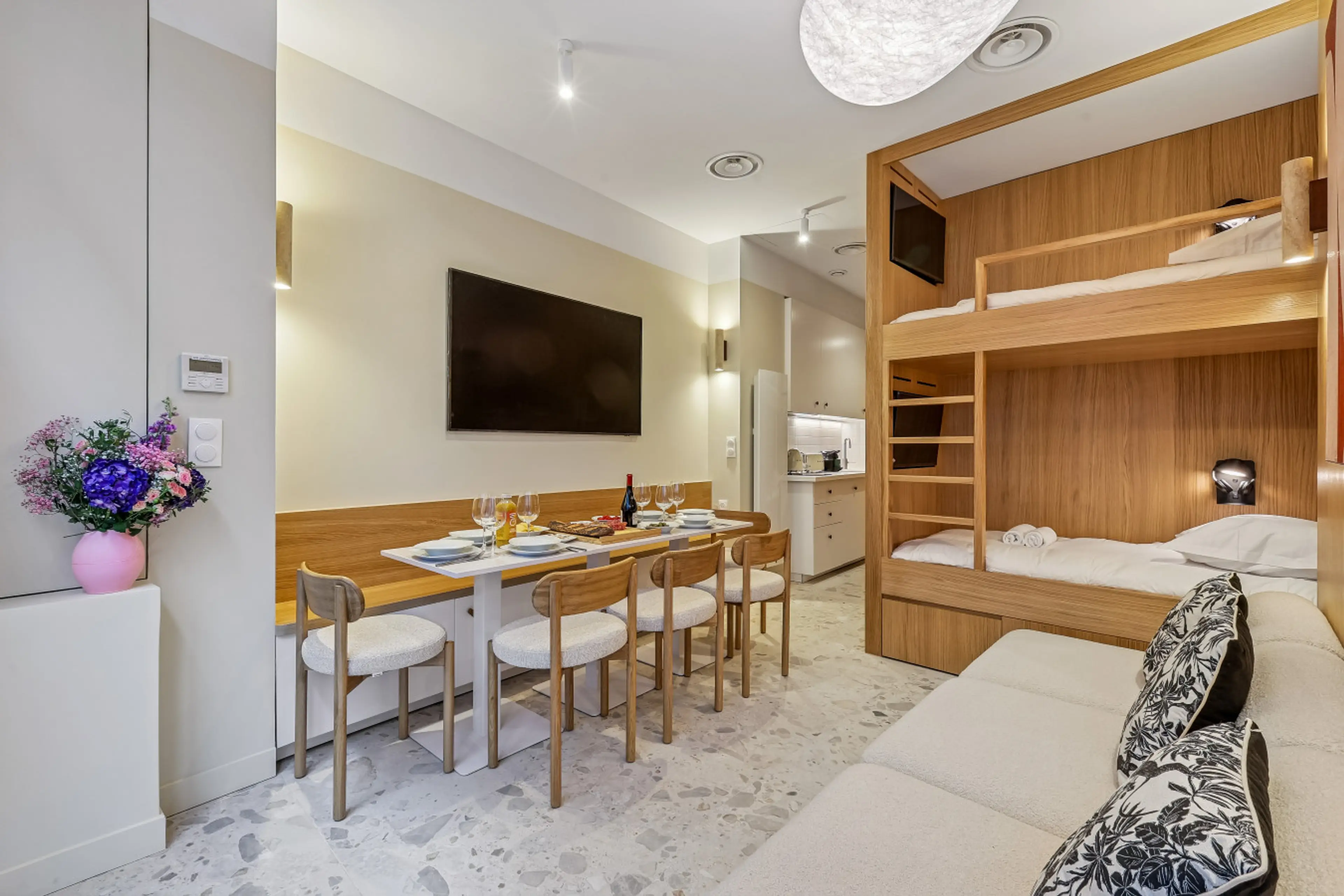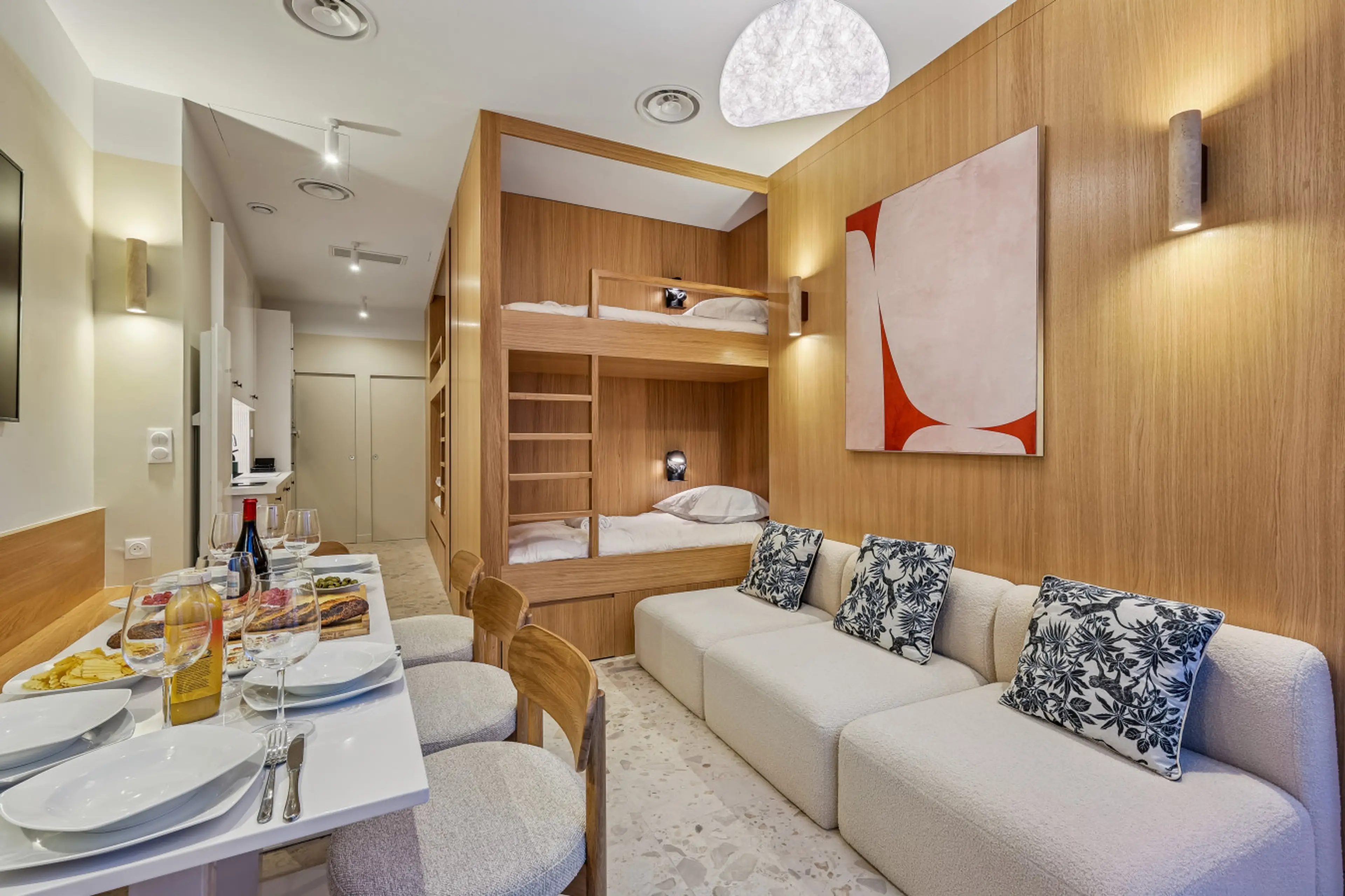 This Lavie Maison apartment offers a unique design concept in the heart of Paris, in the 2nd arrondissement. Located on the ground floor, it accommodates up to 8 guests with 2 double beds and 4 single beds built into custom-made wood structures. The apartment features 2 bathrooms, including one with...